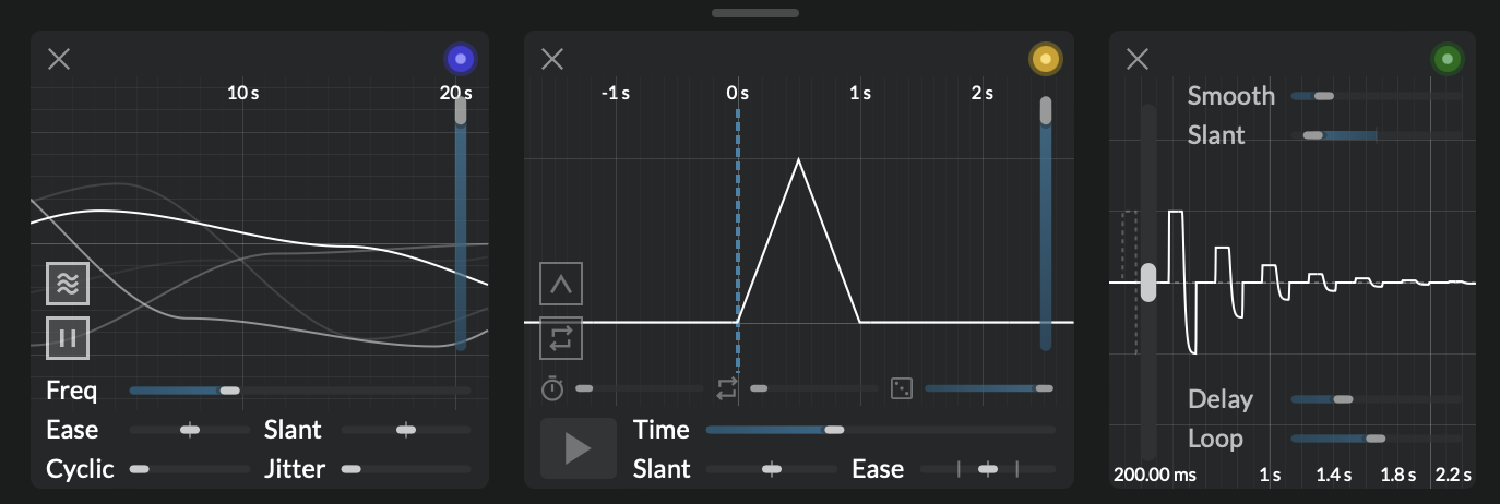 There’s also a control module that acts like a macro with some additional features allowing you to lag any control changes. This lag can be asymmetric too, for example if you want downward motion to lag but not upward motion or vice versa. There’s even a “loop” control that will echo any motion imparted on the control.