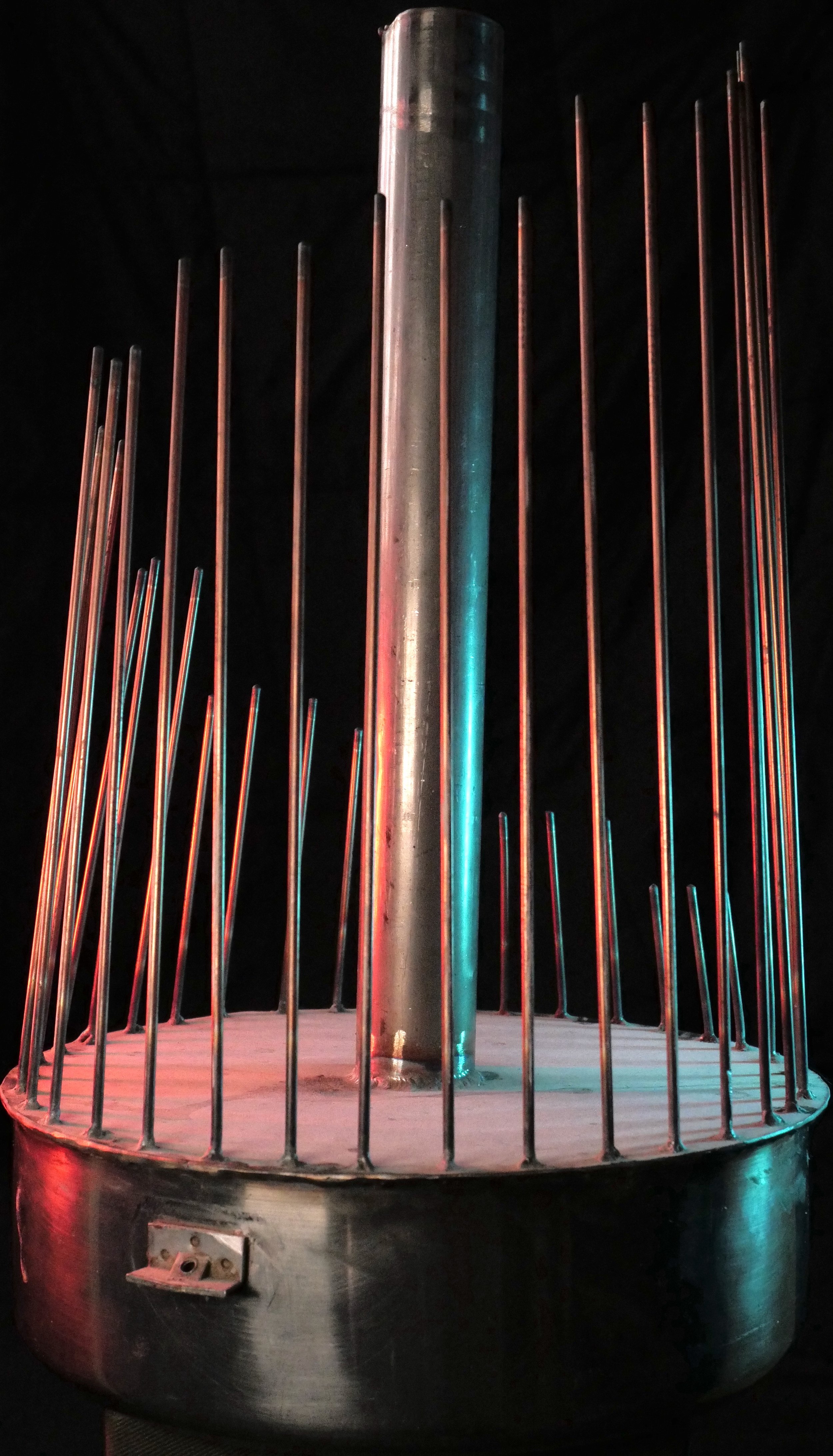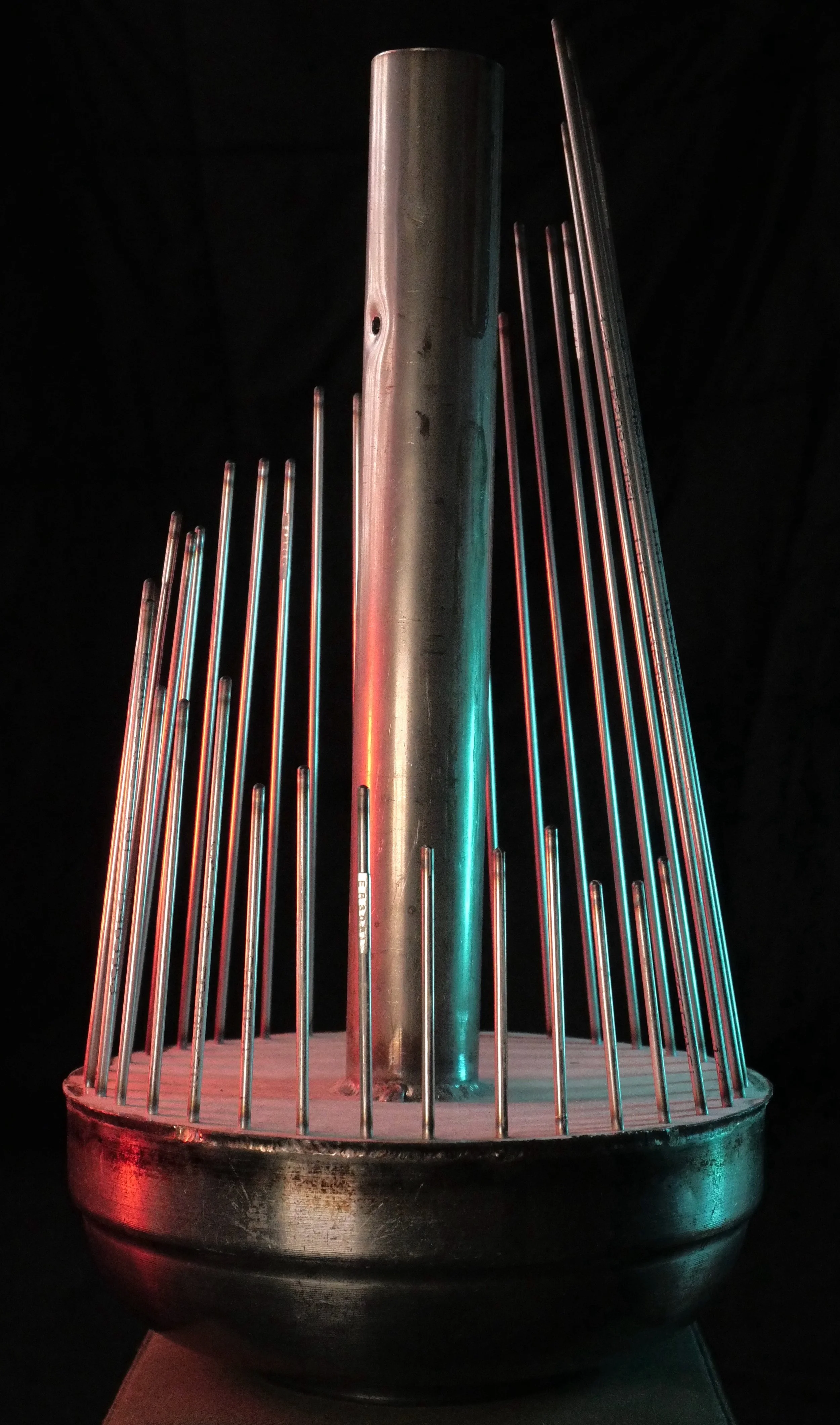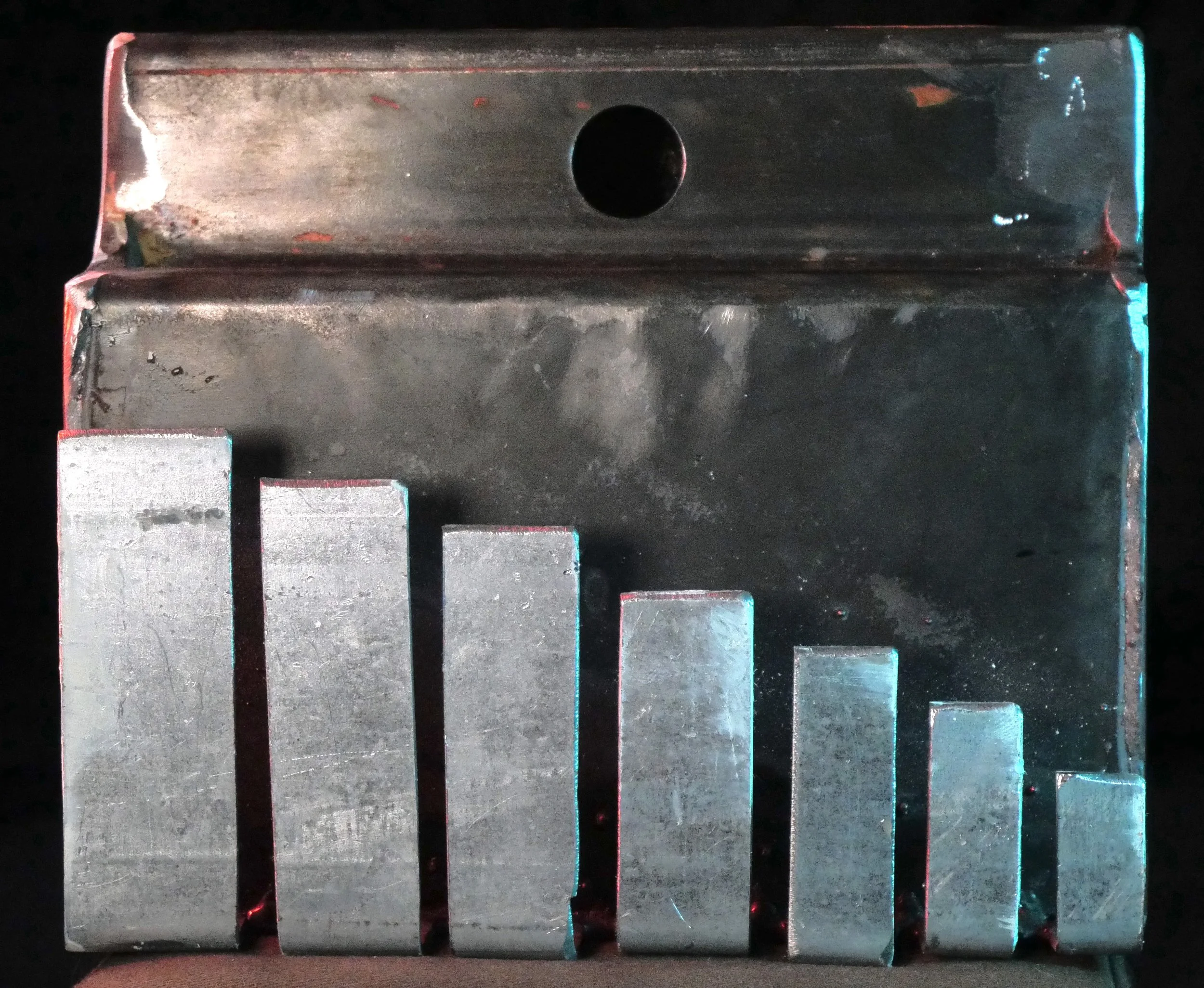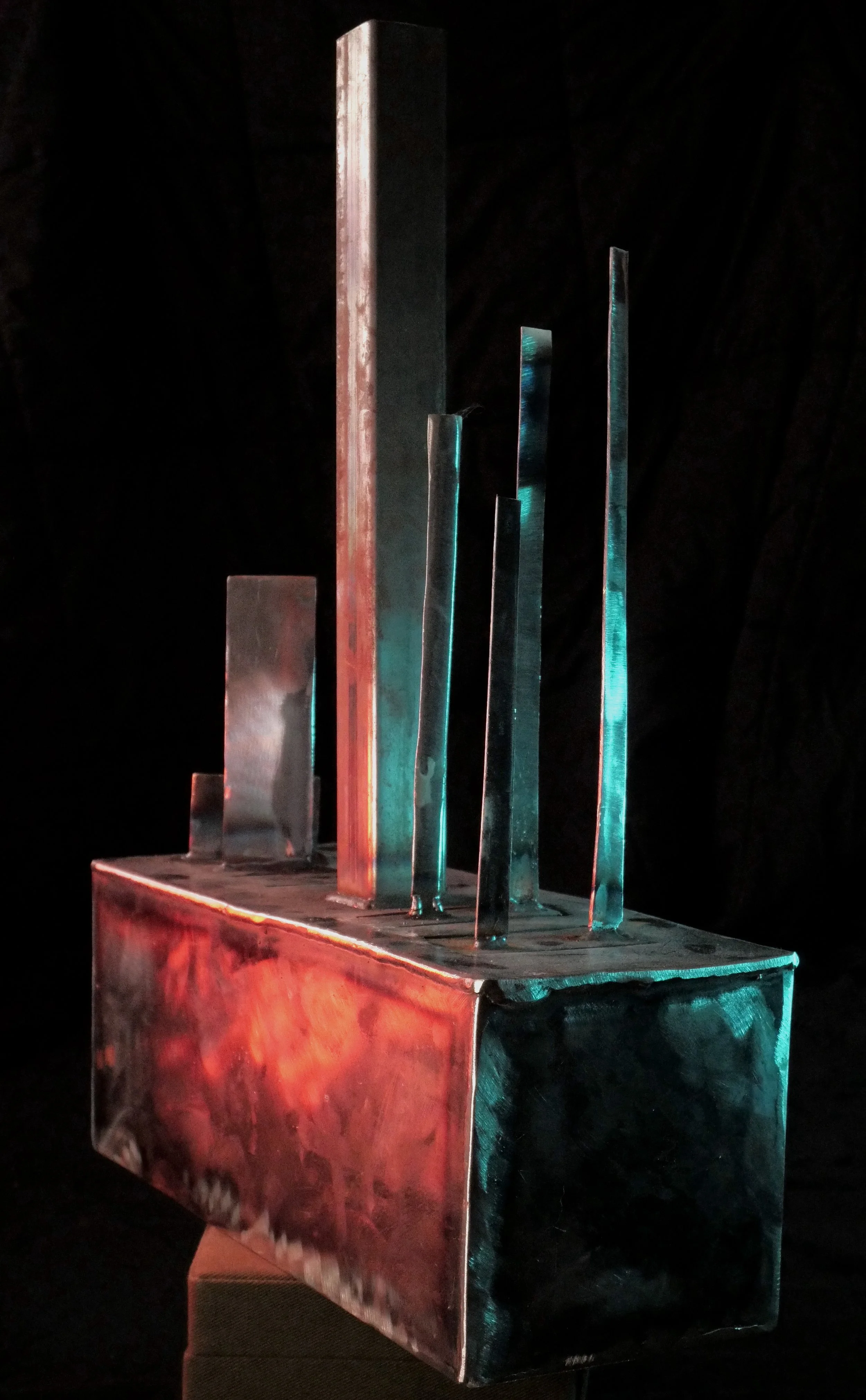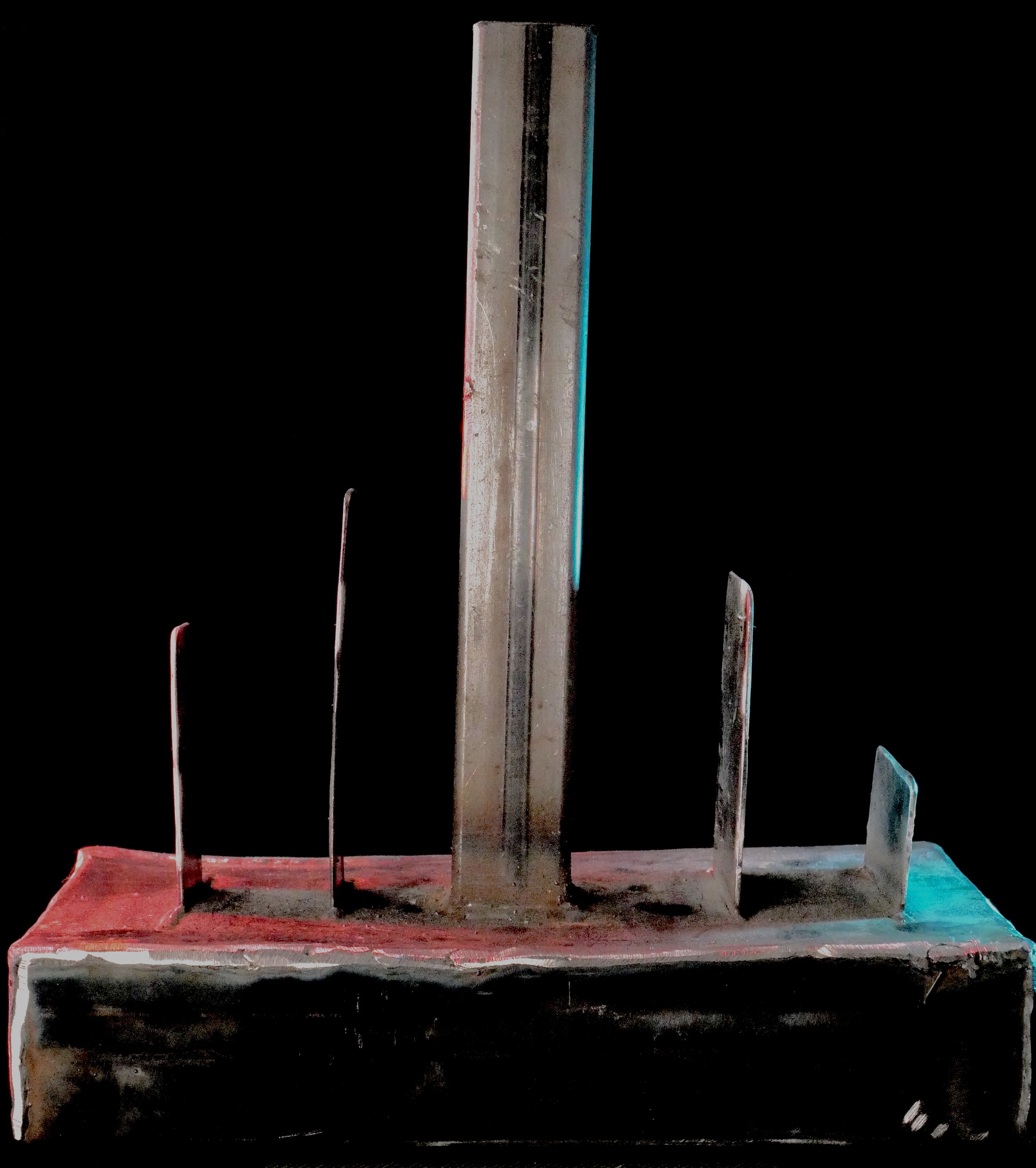 Two “scrap hammers” are made up of a large hollow box with various ribbons of scrap metal and a large handle